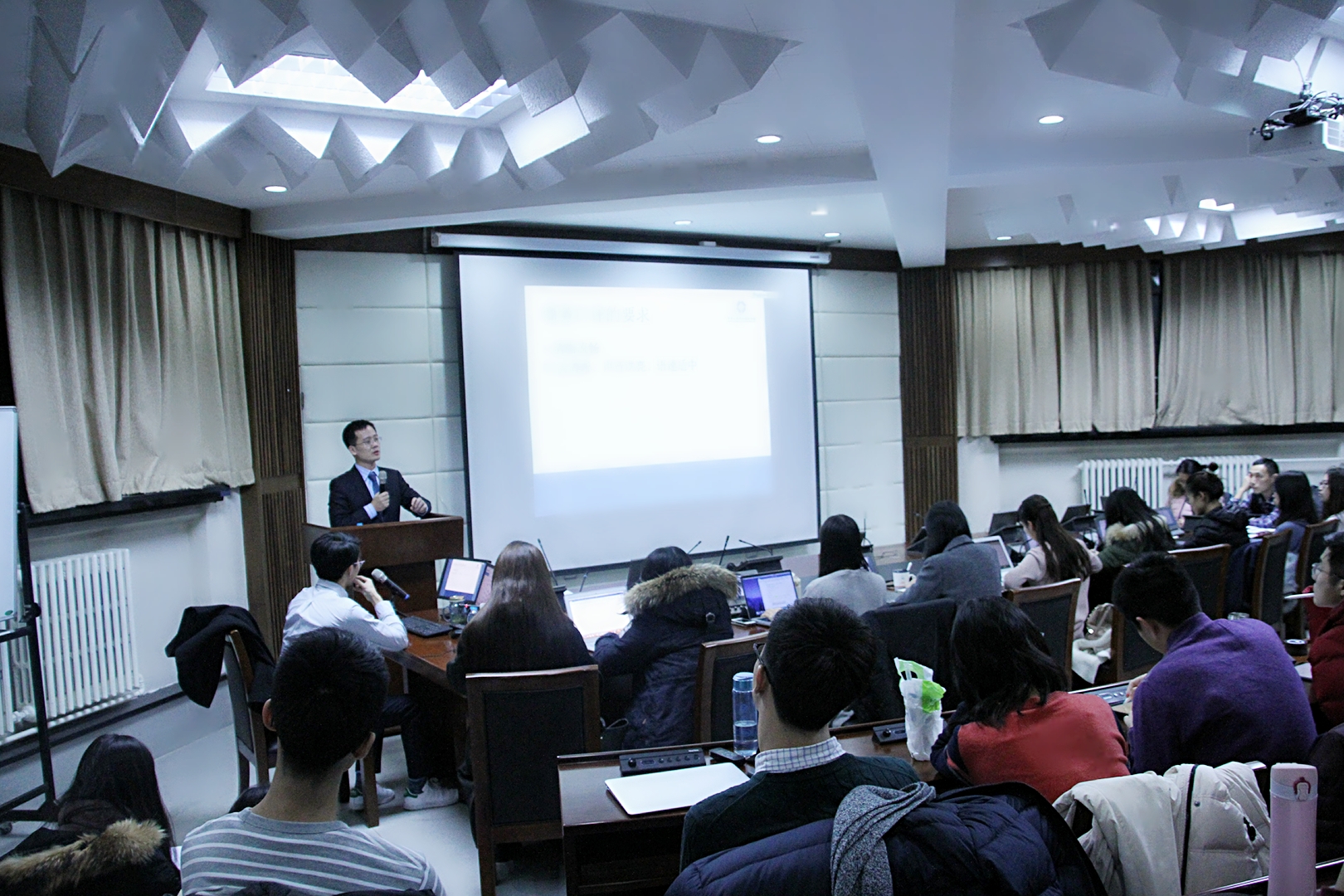 2017年12月11日,在电教楼150人教室,商务部翻译处副处长王健卿为同学们带来了一场非常精彩的讲座。王健卿副处长是北外高翻的校友,先后在外交部翻译室和商务部翻译处工作,现任商务部翻译处副处长。他有着非常丰富的人生阅历,不仅于2009年获得了英国威斯敏斯特大学外交学硕士学位,还于2014年赴欧盟口译总司,担任中欧同传培训项目的访问学者,多年以来他为国家领导人,外交部、商务部等部委领导,以及许多重要国际会议提供口笔译服务。