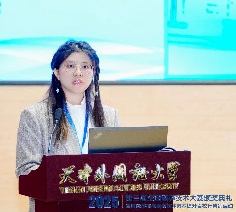 在这场高水平赛事中,betway2025级中英会议口译专业7班肖薇同学表现出色,荣获译后编辑赛道全国一等奖,并作为获奖代表在颁奖典礼上发言,展现了betway学子卓越的专业素养与技术应用能力。在发言中,肖薇分享了对人机协同翻译模式的体会。她表示,现代译者需兼具语言艺术家的细腻与技术专家的敏锐,不仅要打磨文字,也需善用工具。她认为,保持终身学习的能力、培养“语言+专业+技术”的复合素养,是应对技术革新的关键。